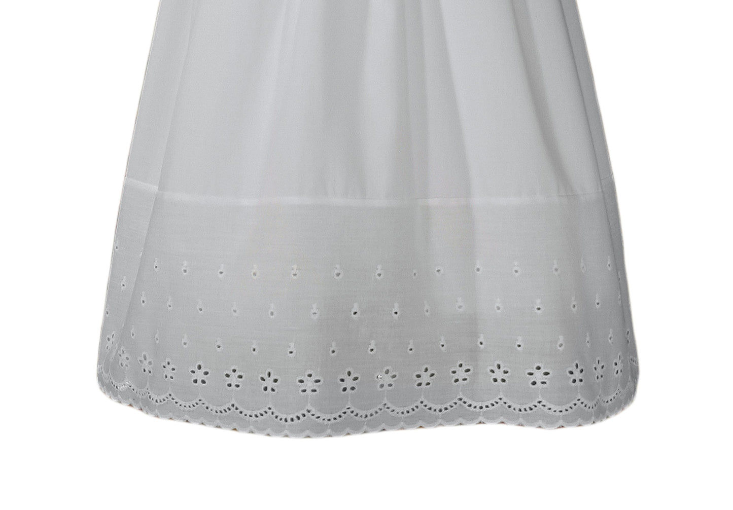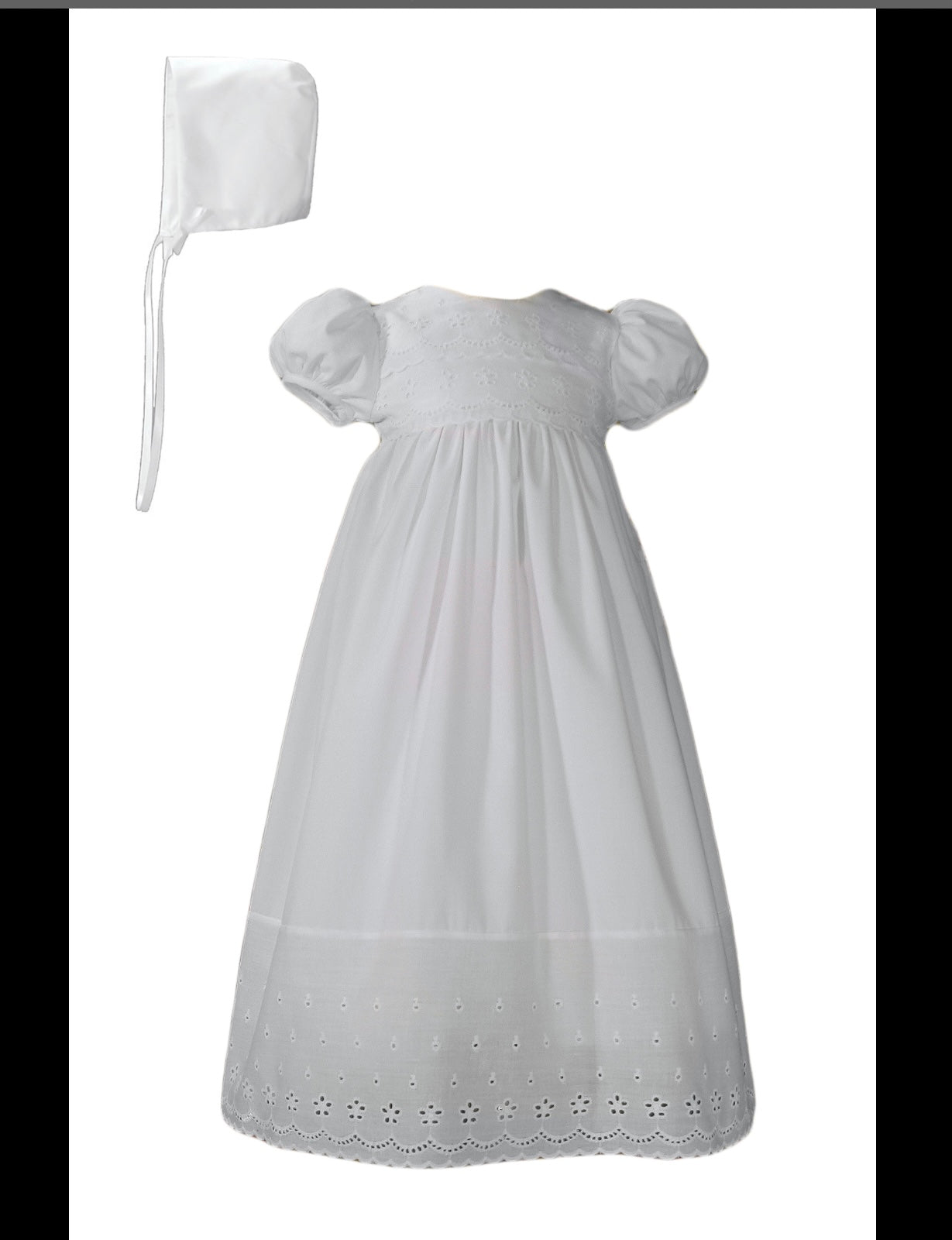 Beautiful girls 100% cotton Christening special occasion gown. Features floral border eyelet across the bodice and hem that offers a traditional and elegant look. The gown measures 24 inches in length; includes matching bonnet.