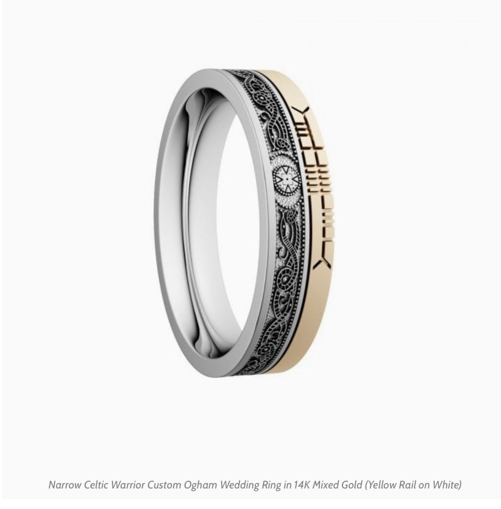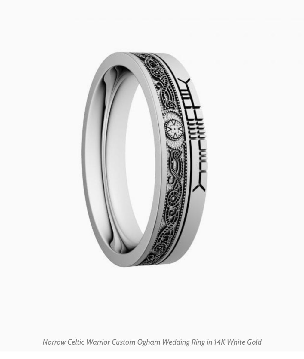 The Narrow Version of our Celtic Warrior Faith Collection Wedding Band, customizable Ogham text to suit your special message . These Boru signature high quality stunning Celtic rings are inscribed with the ancient Ogham script, the Celtic Alphabet, with the word FAITH.