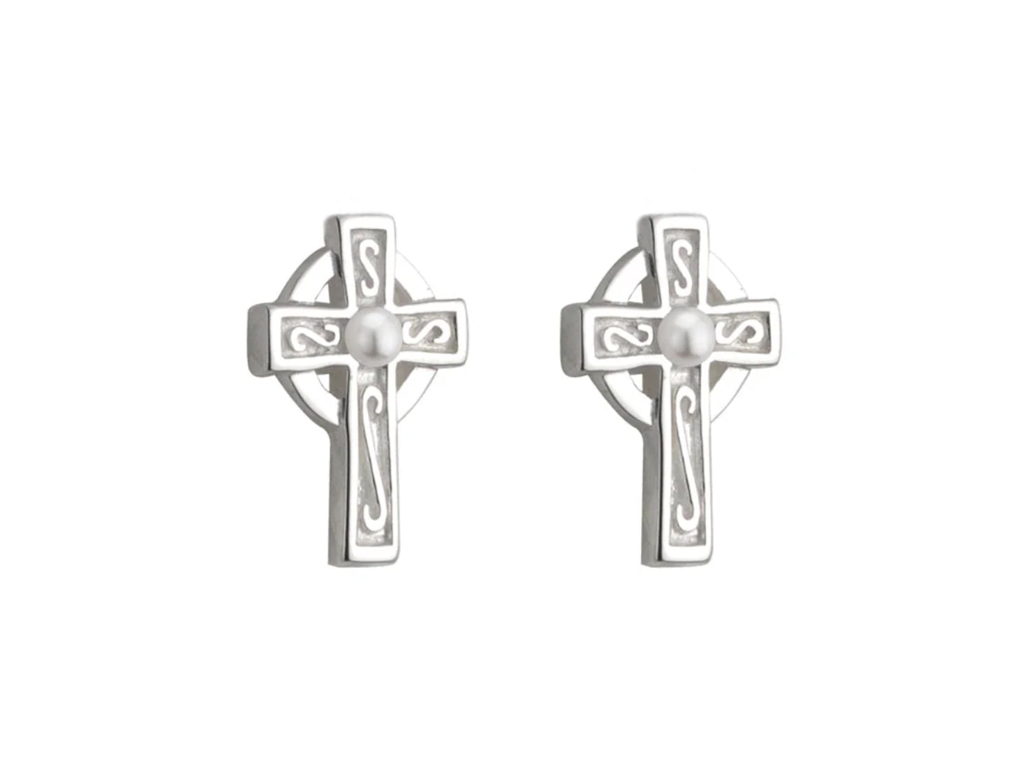 Rhodium Plated Celtic Cross Earrings w/ Pearl Detail In Middle